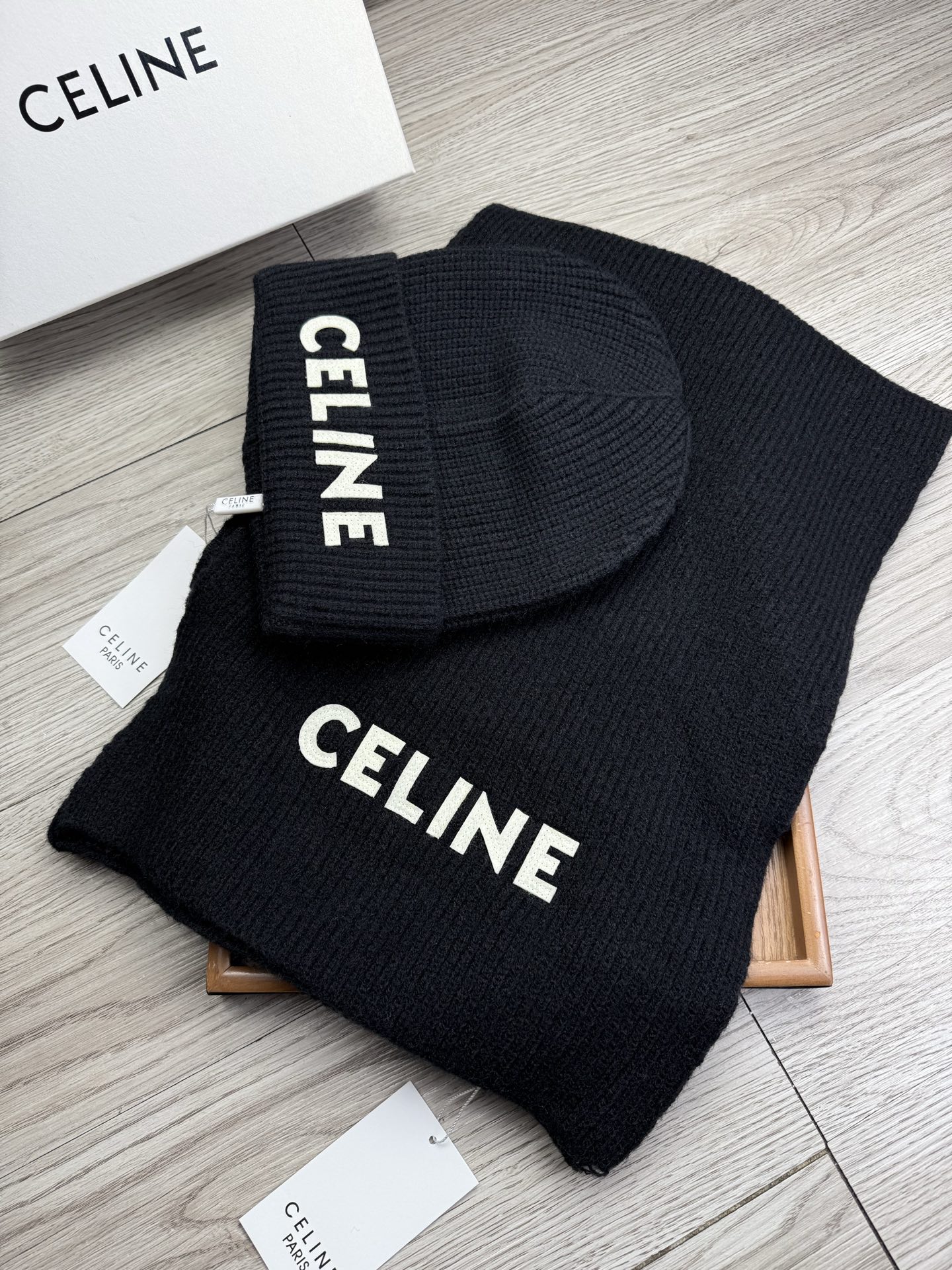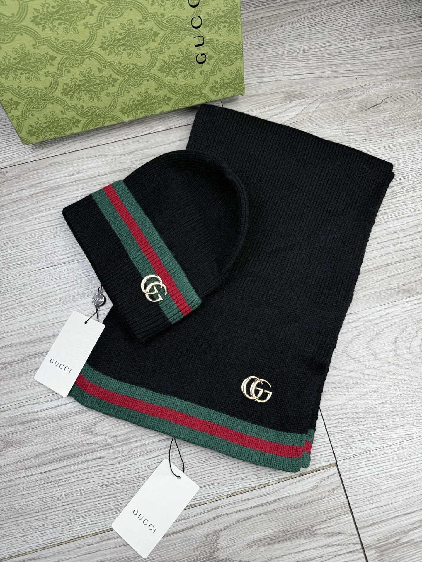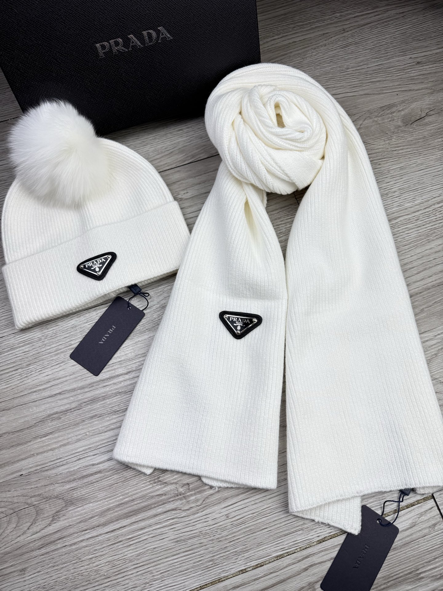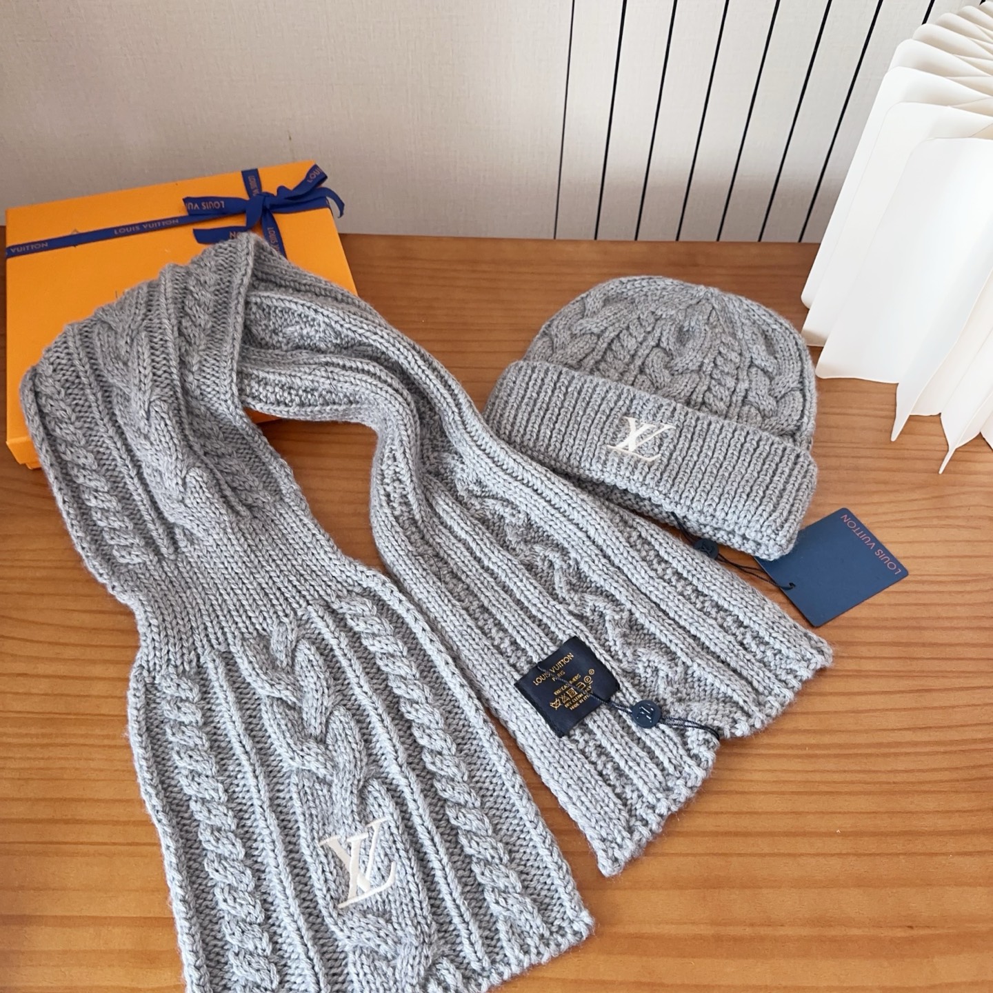 Leather logo knitted scarf and hat set