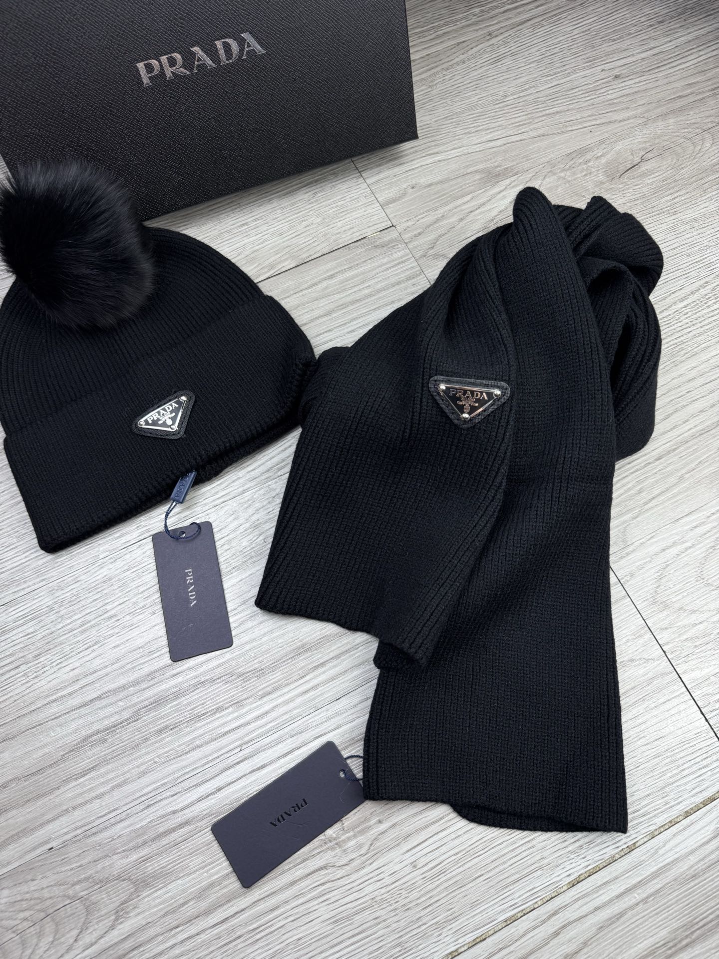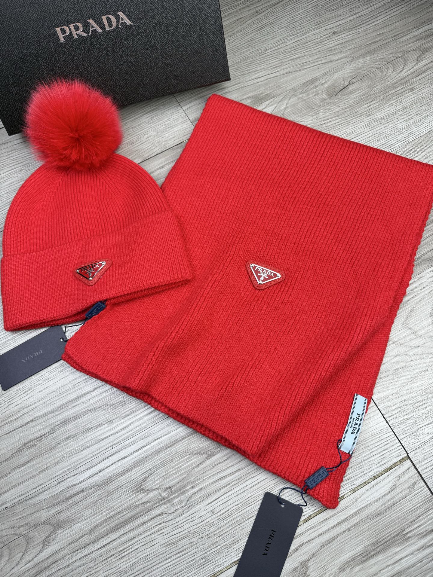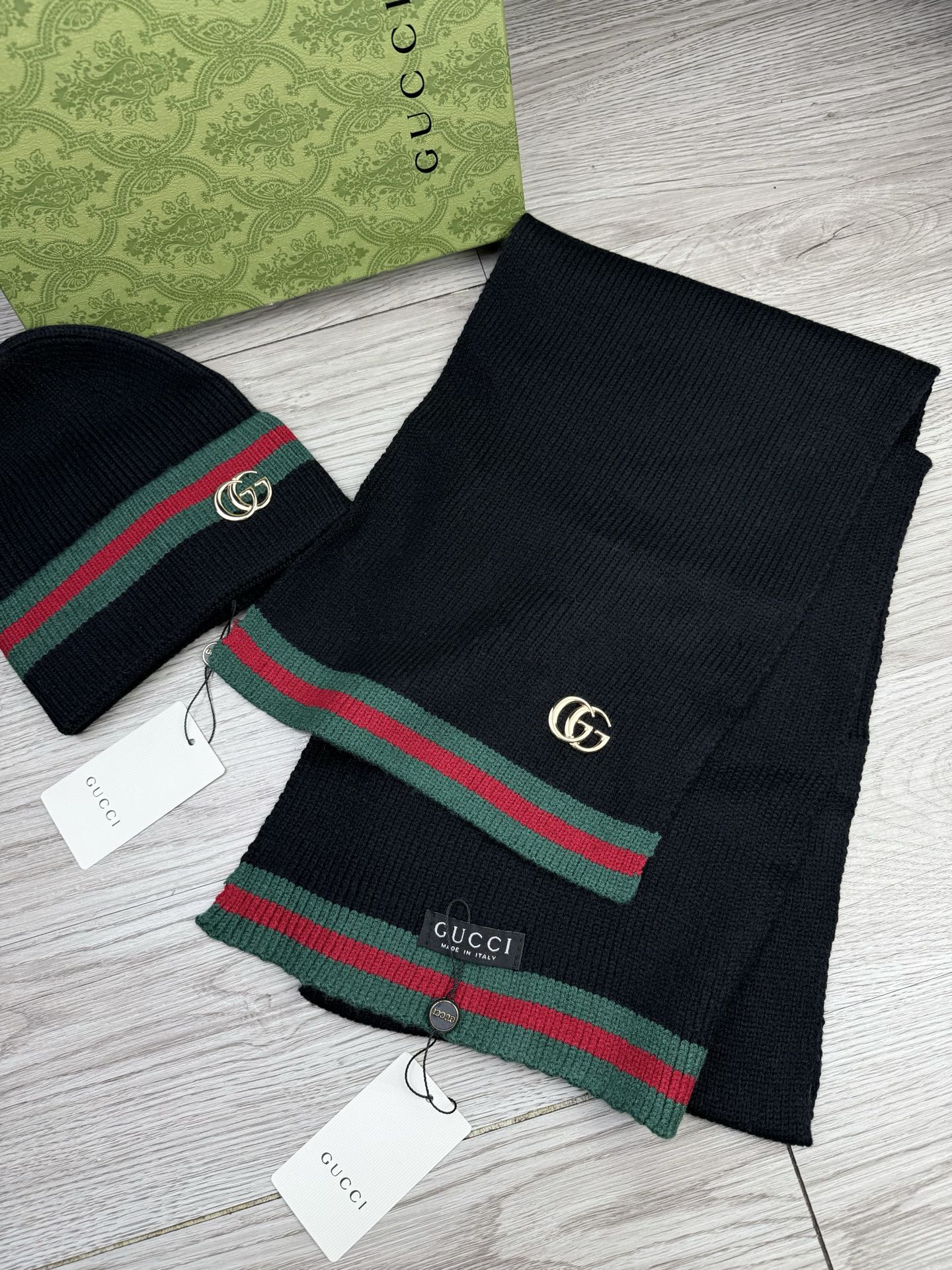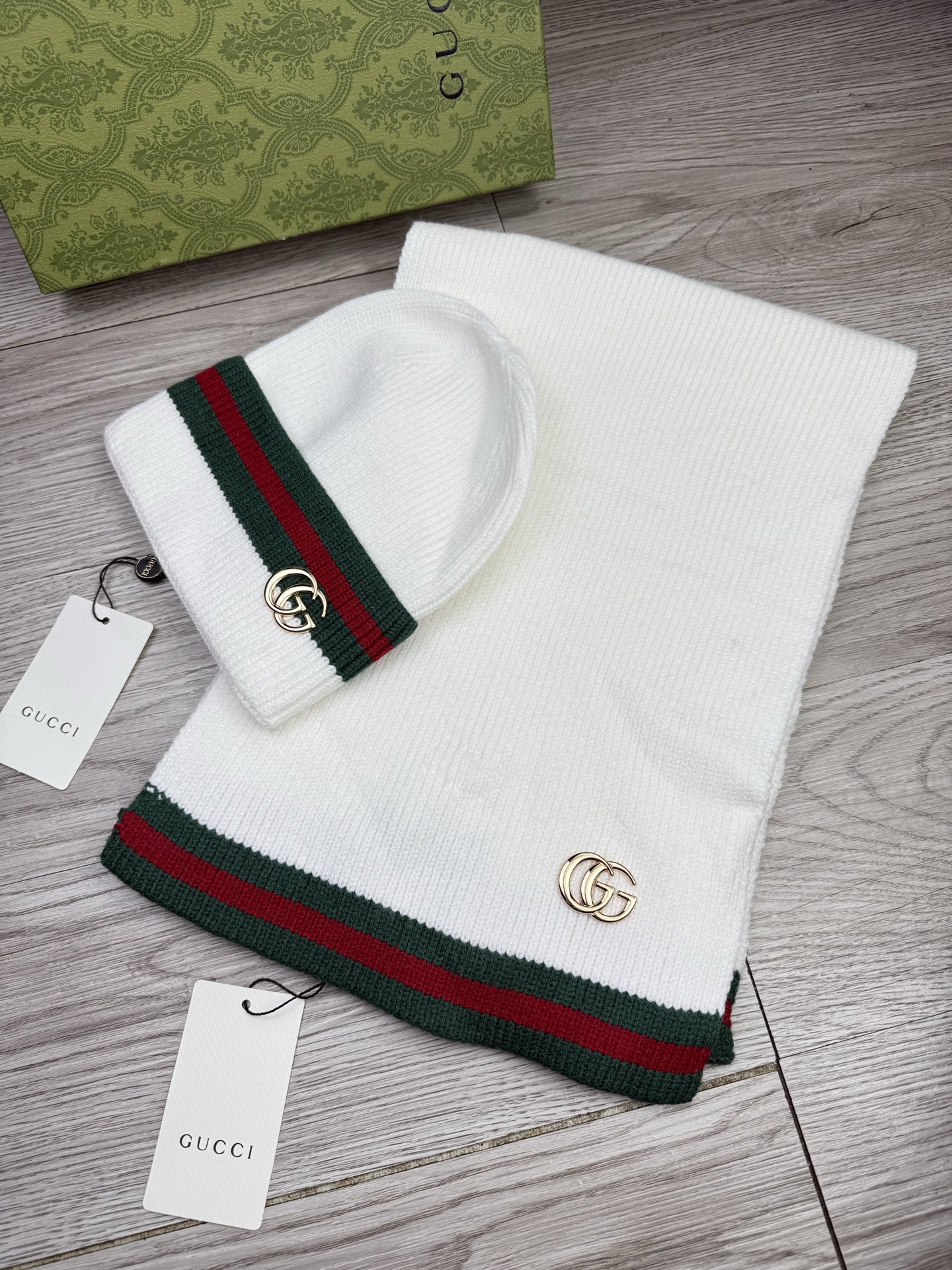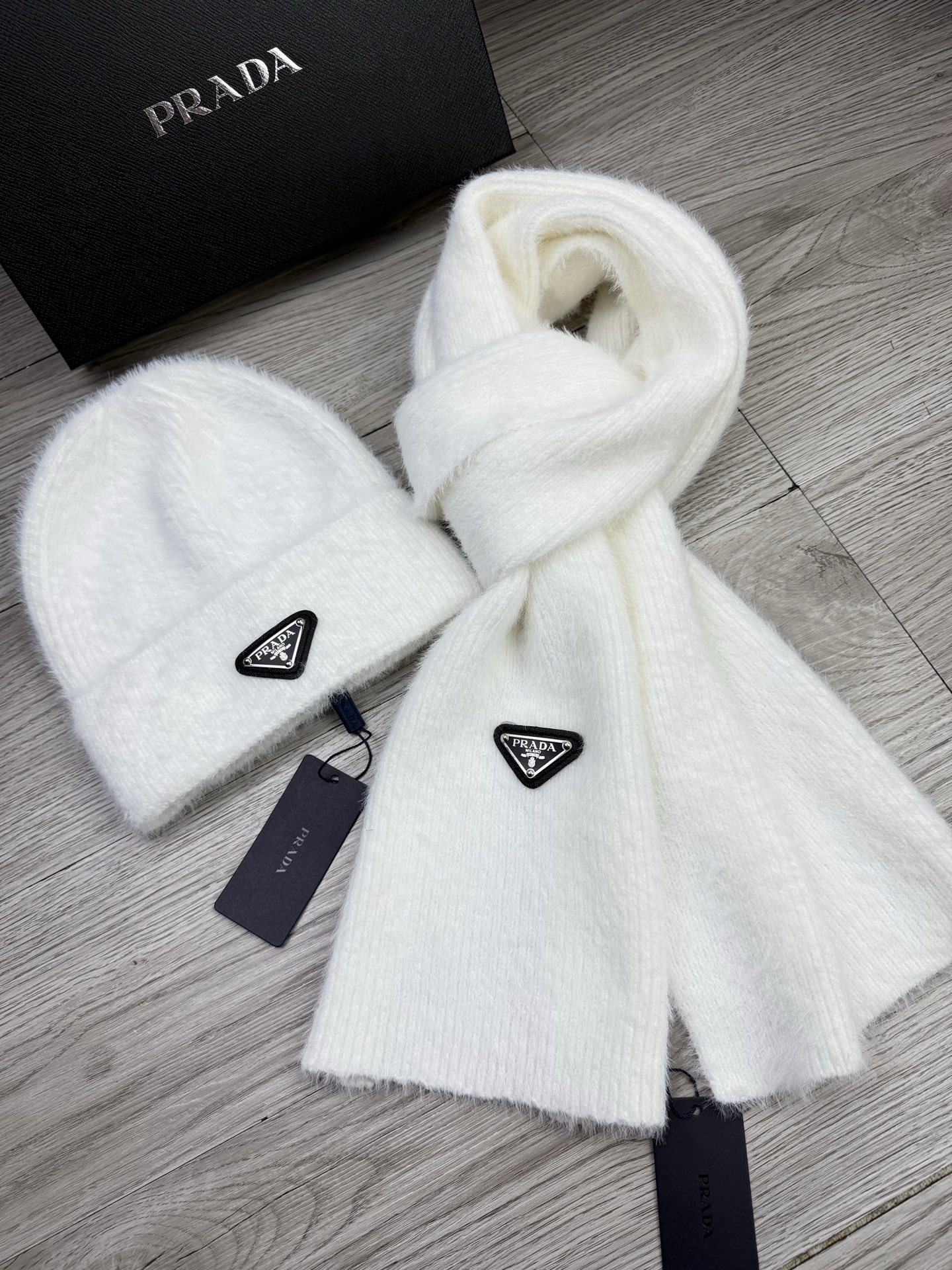 Leather logo knitted scarf and hat set