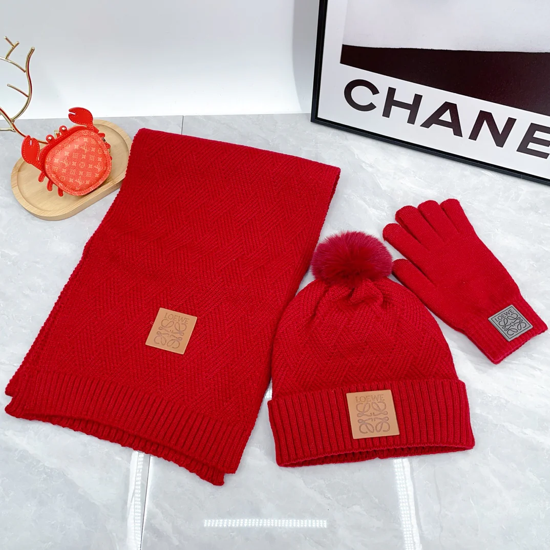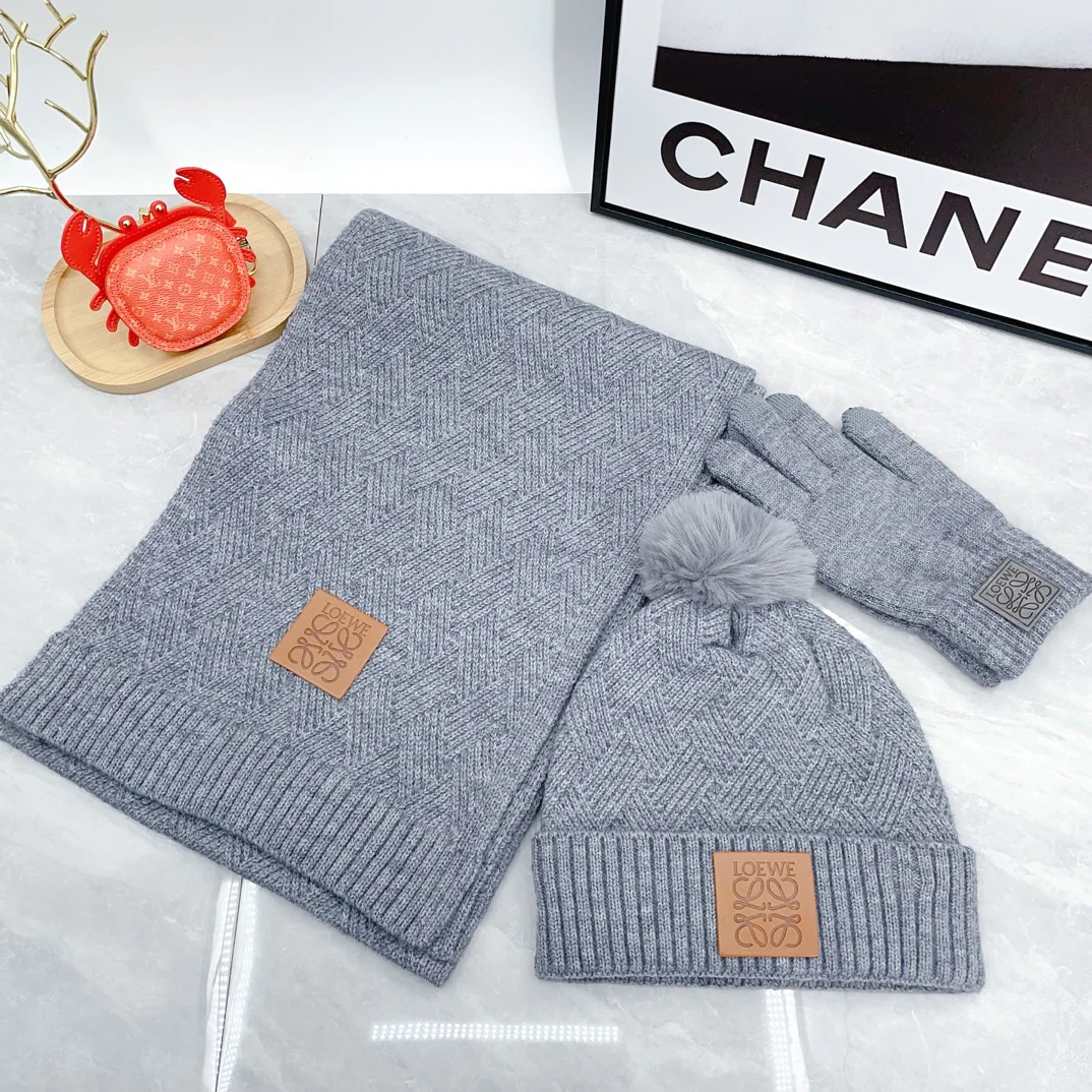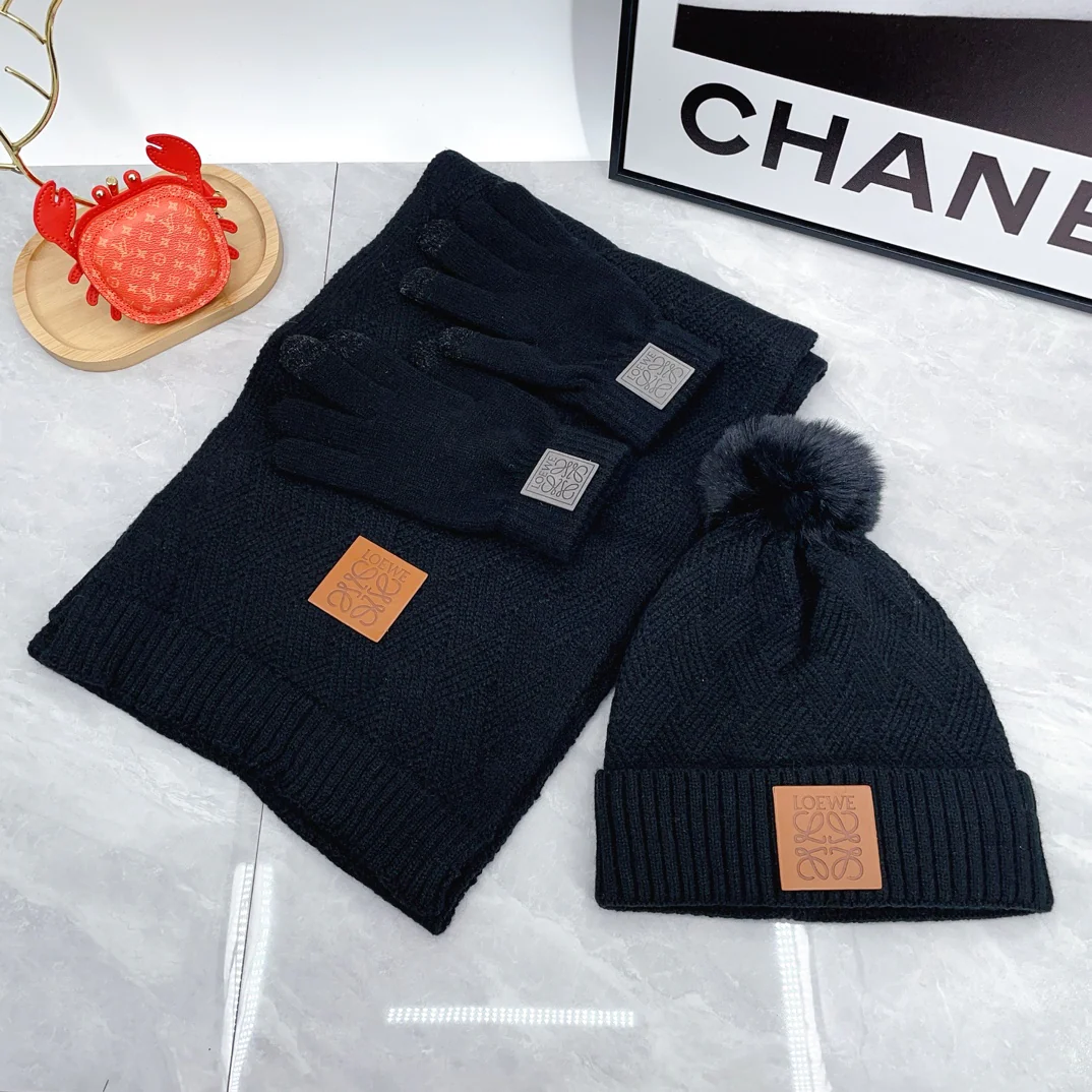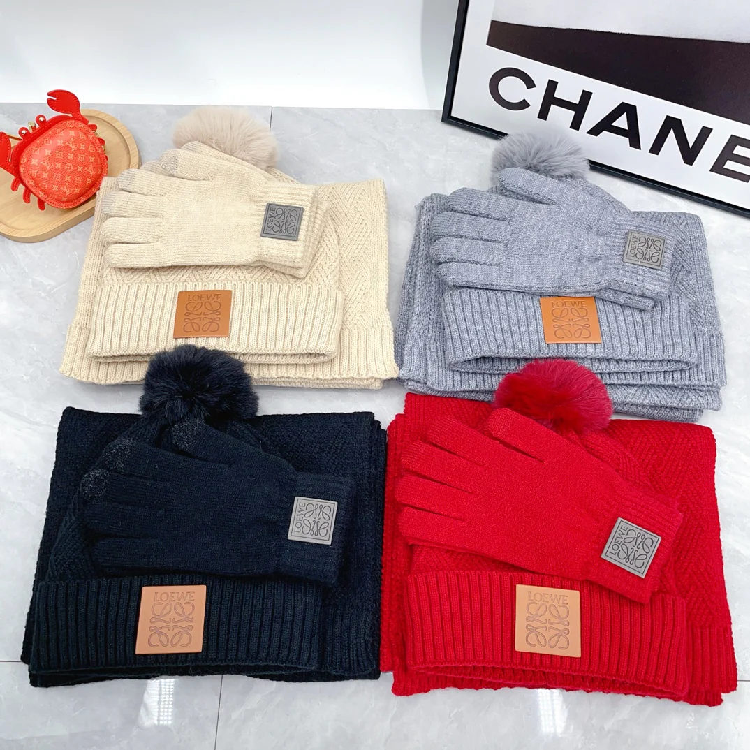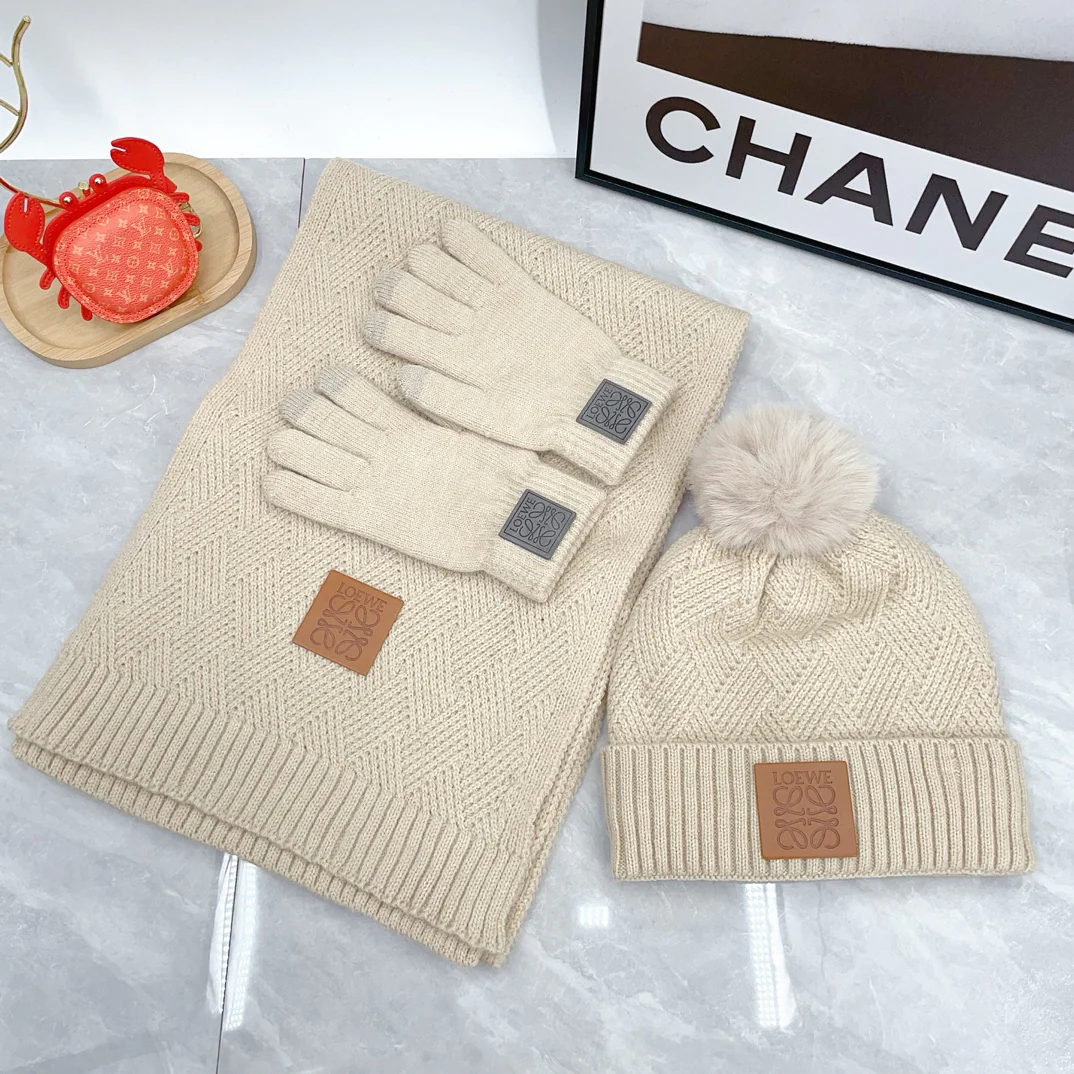 Leather label knitted scarf hat gloves set