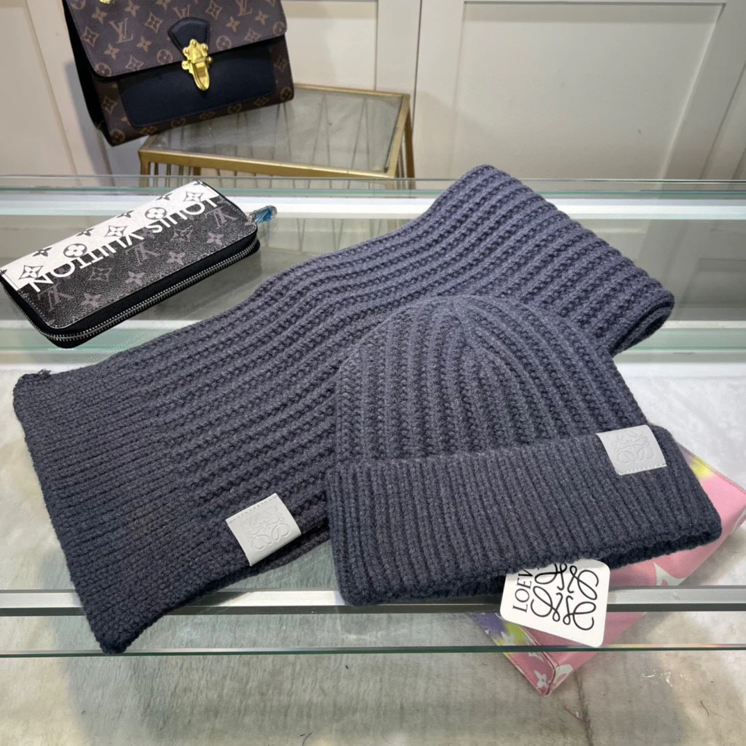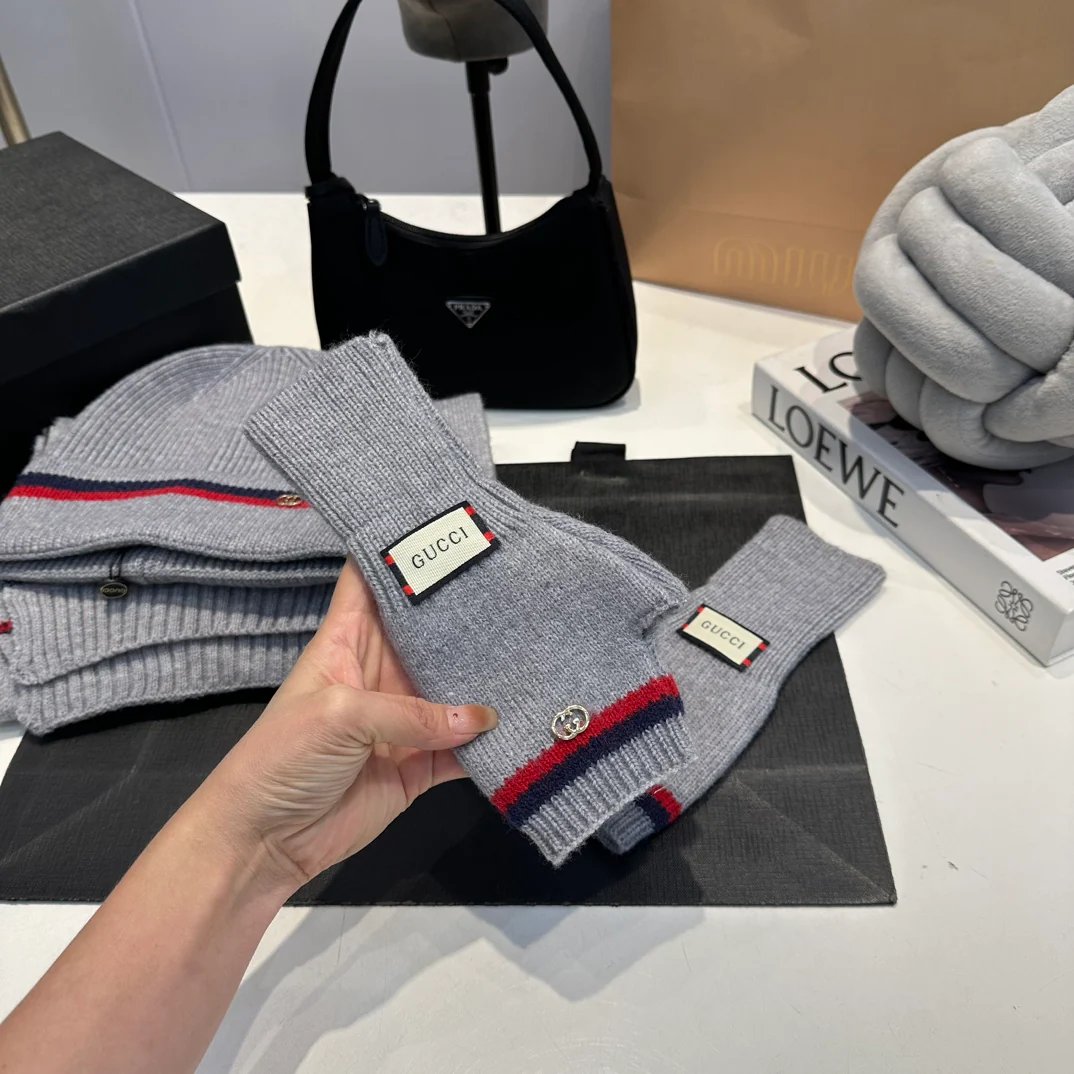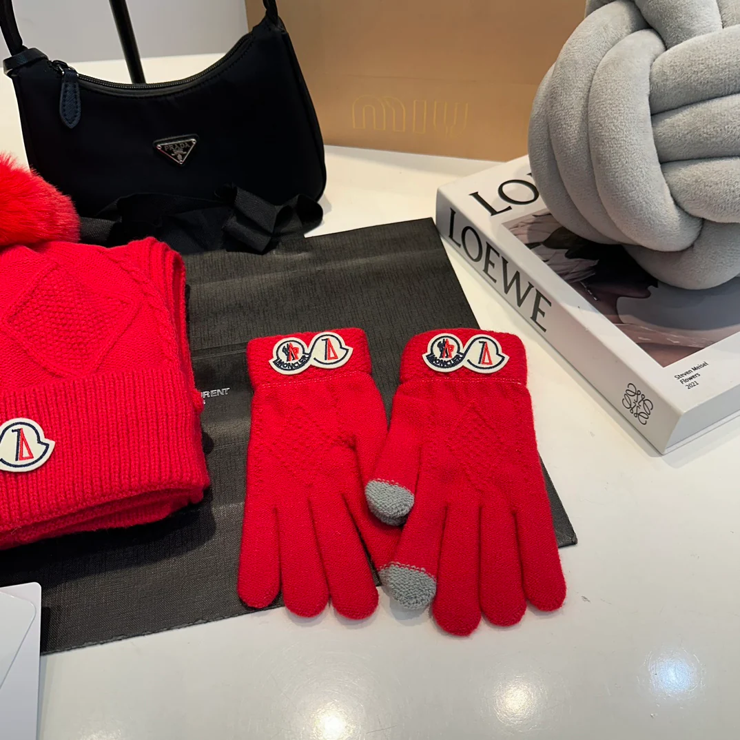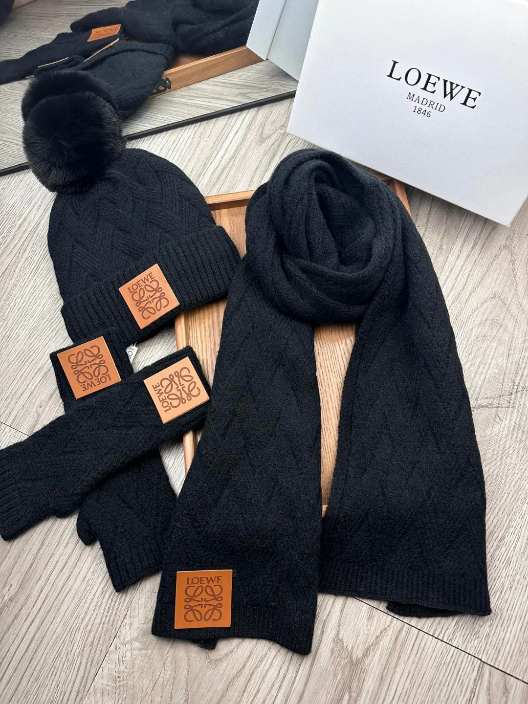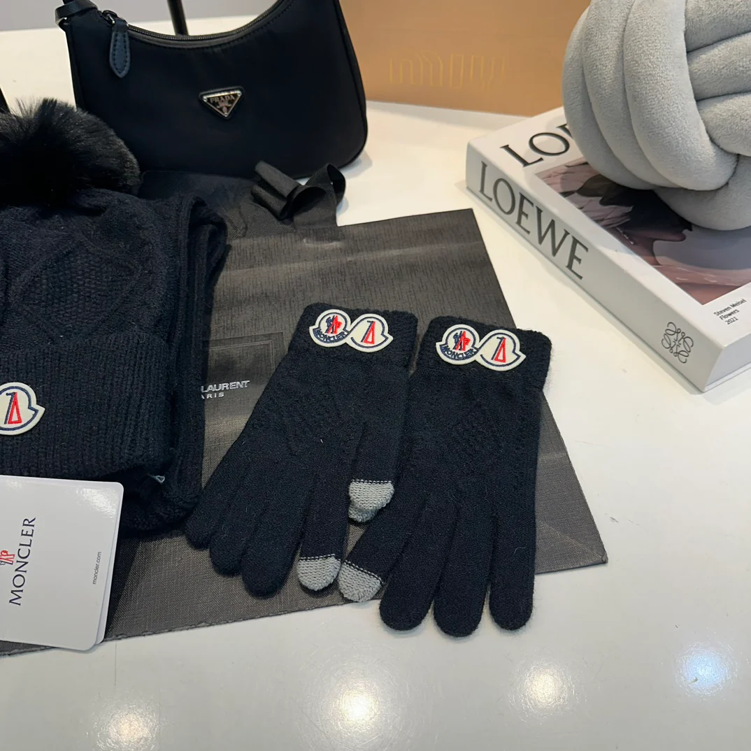 Leather label knitted scarf hat gloves set