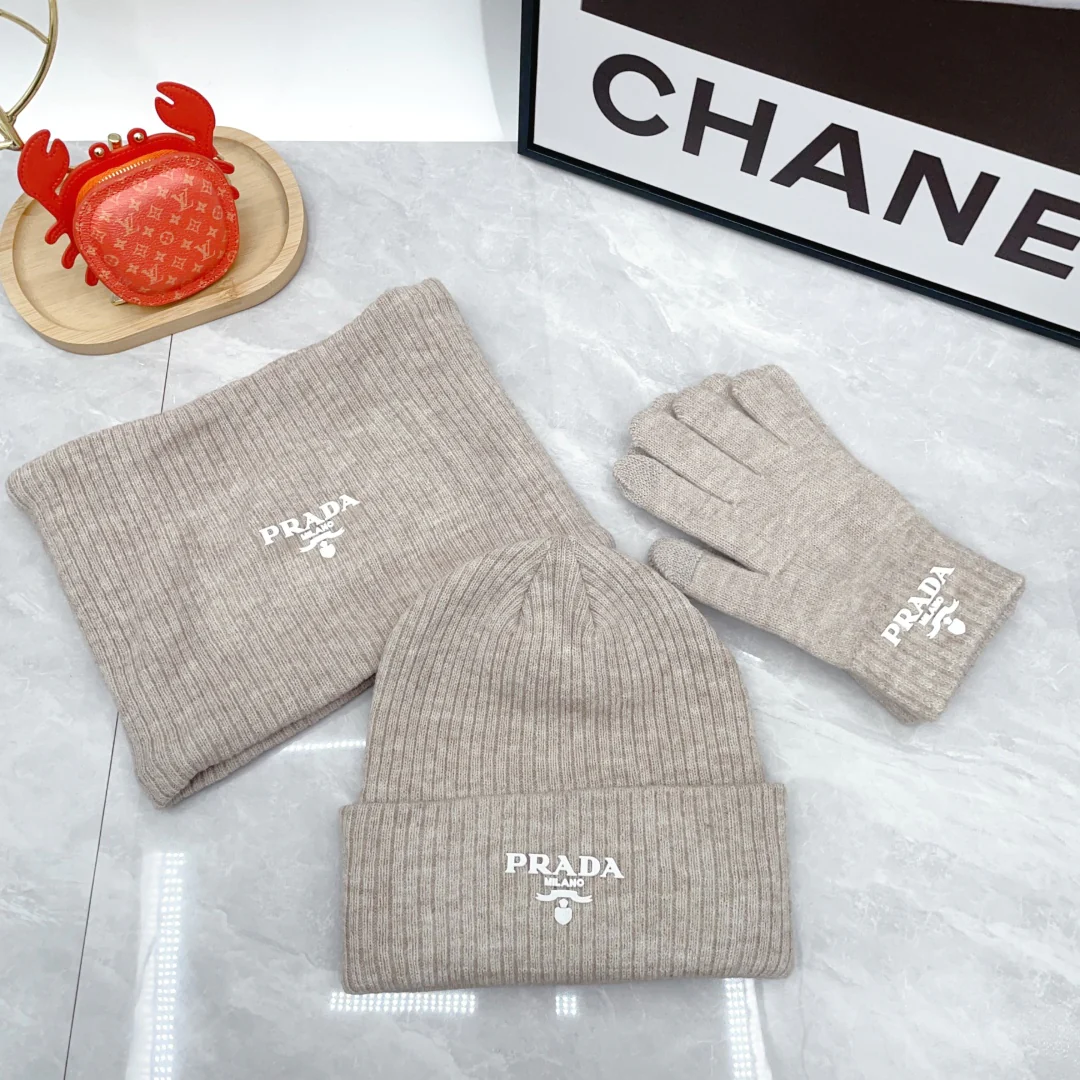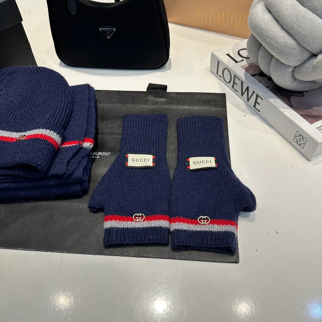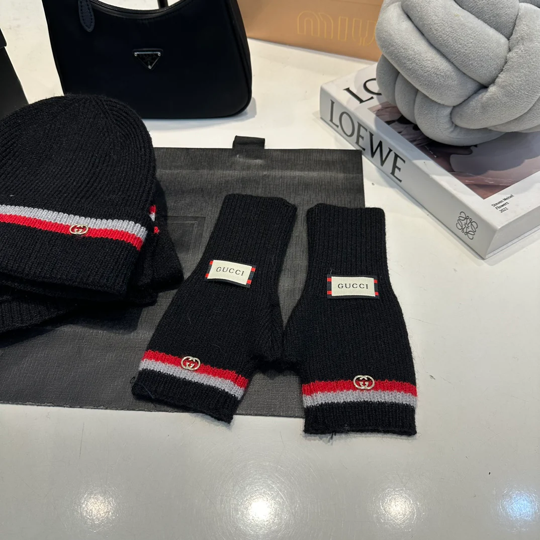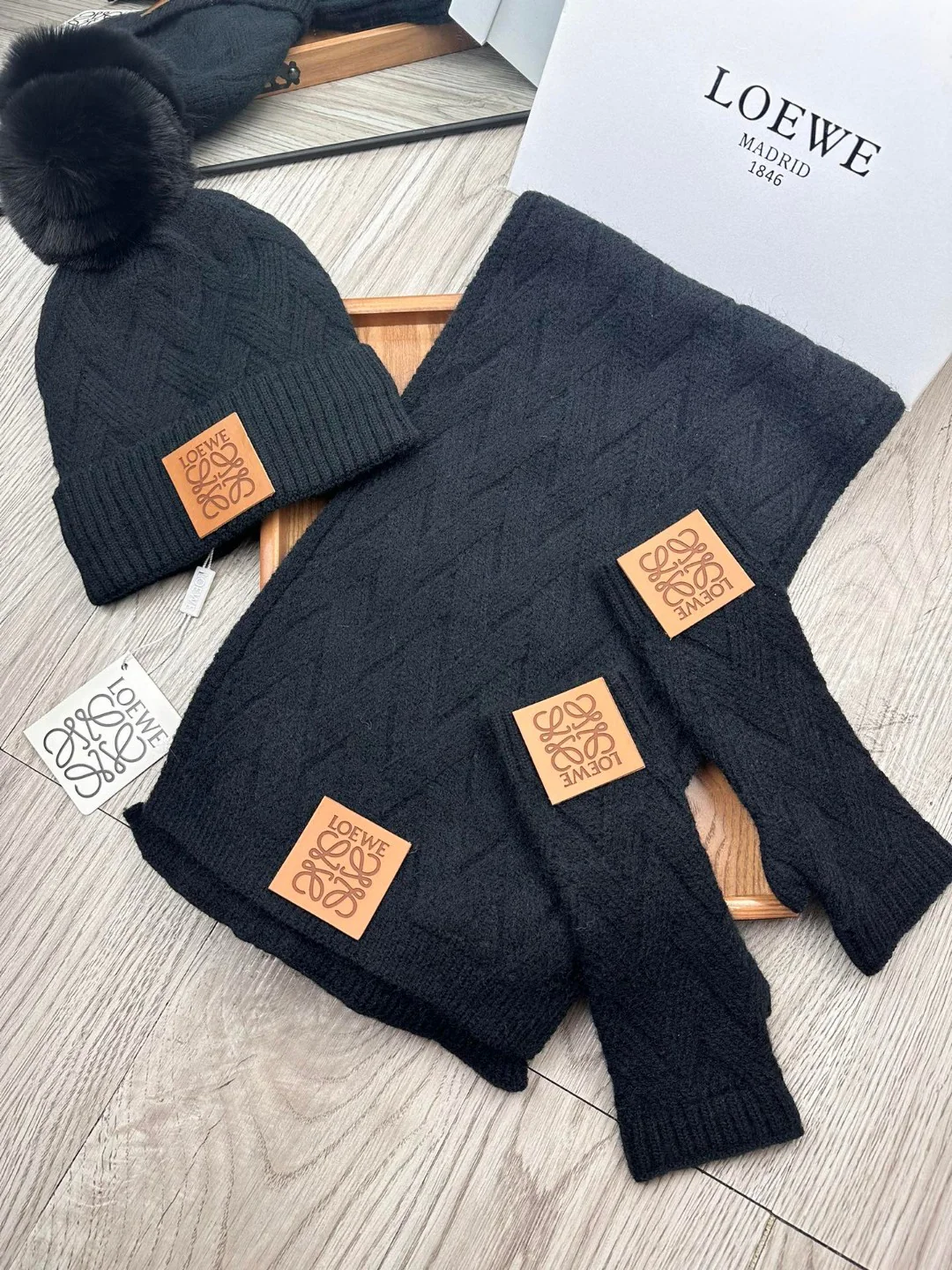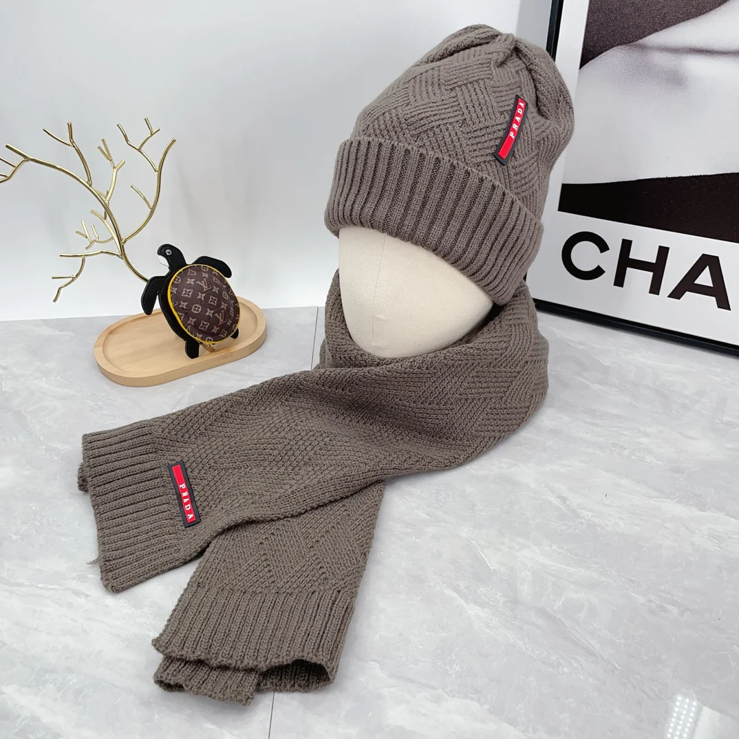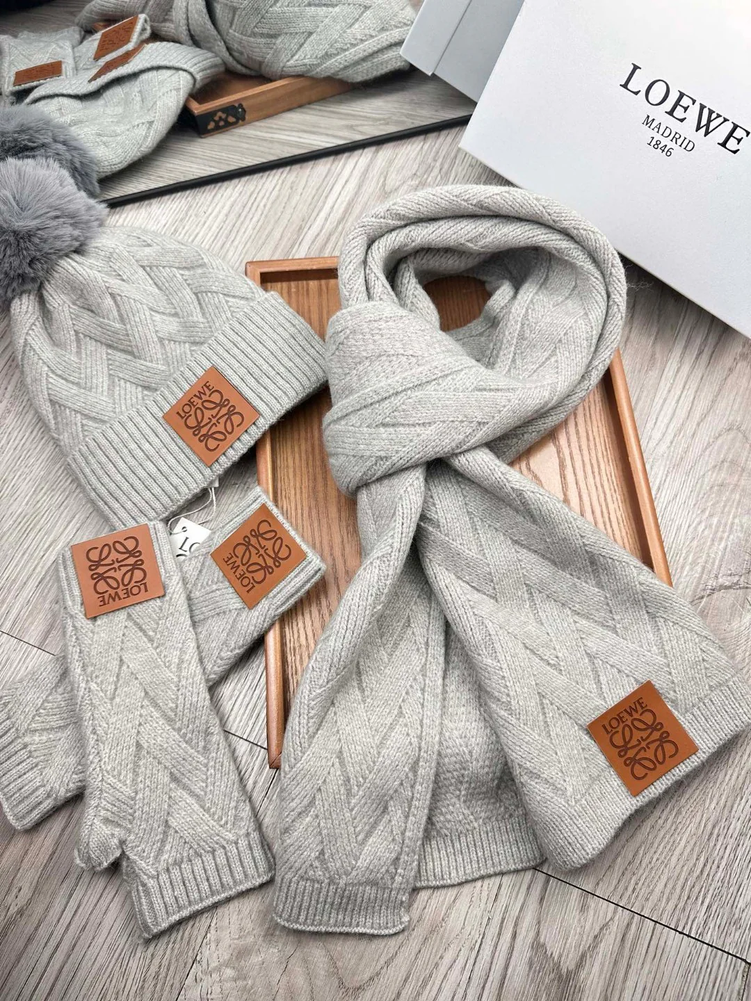 Leather label knitted scarf hat gloves set