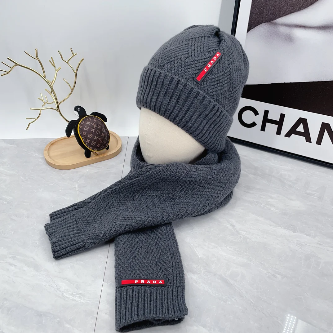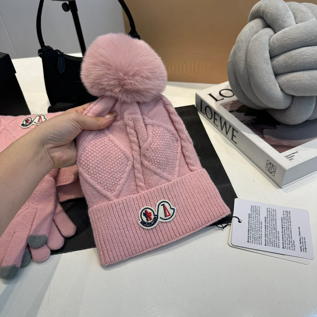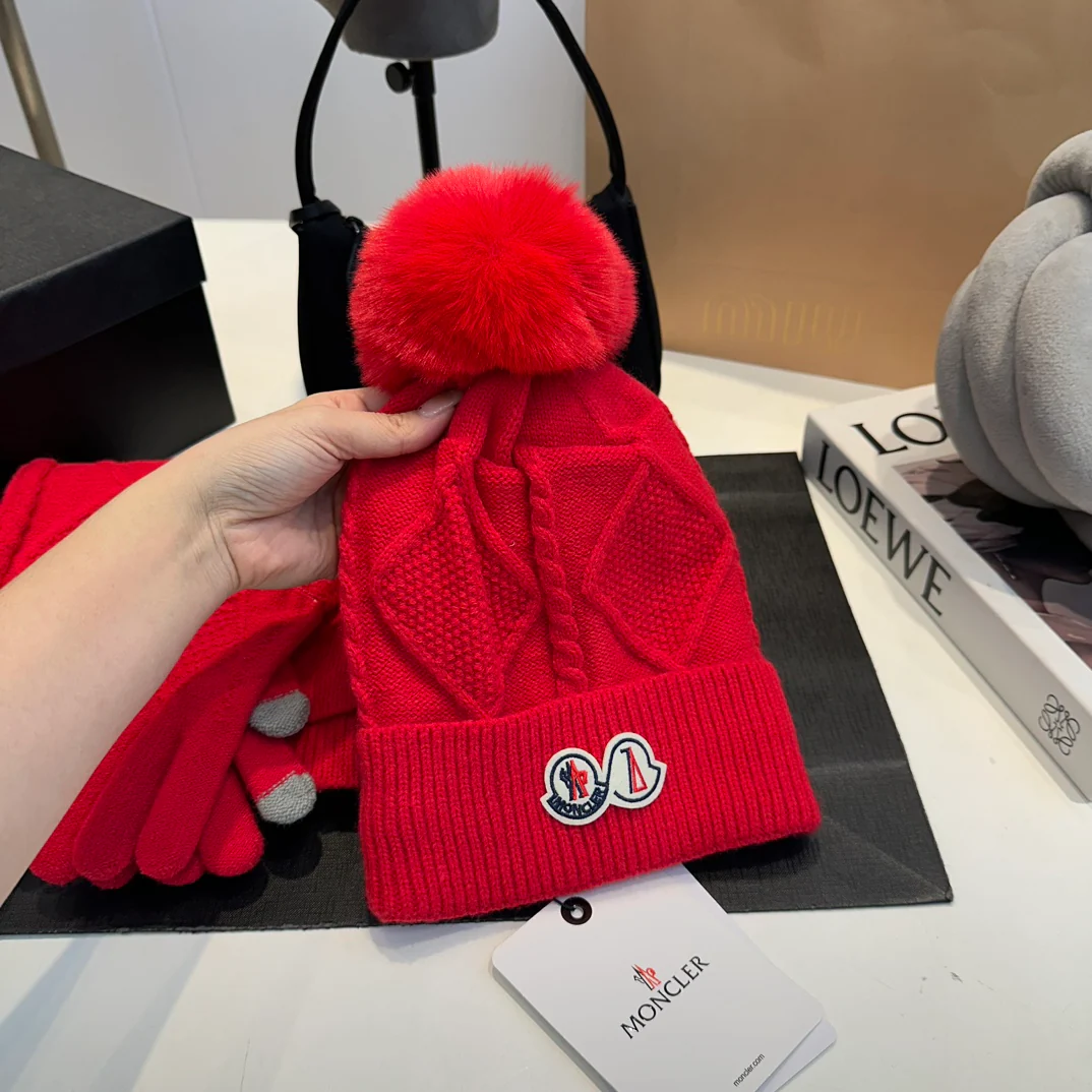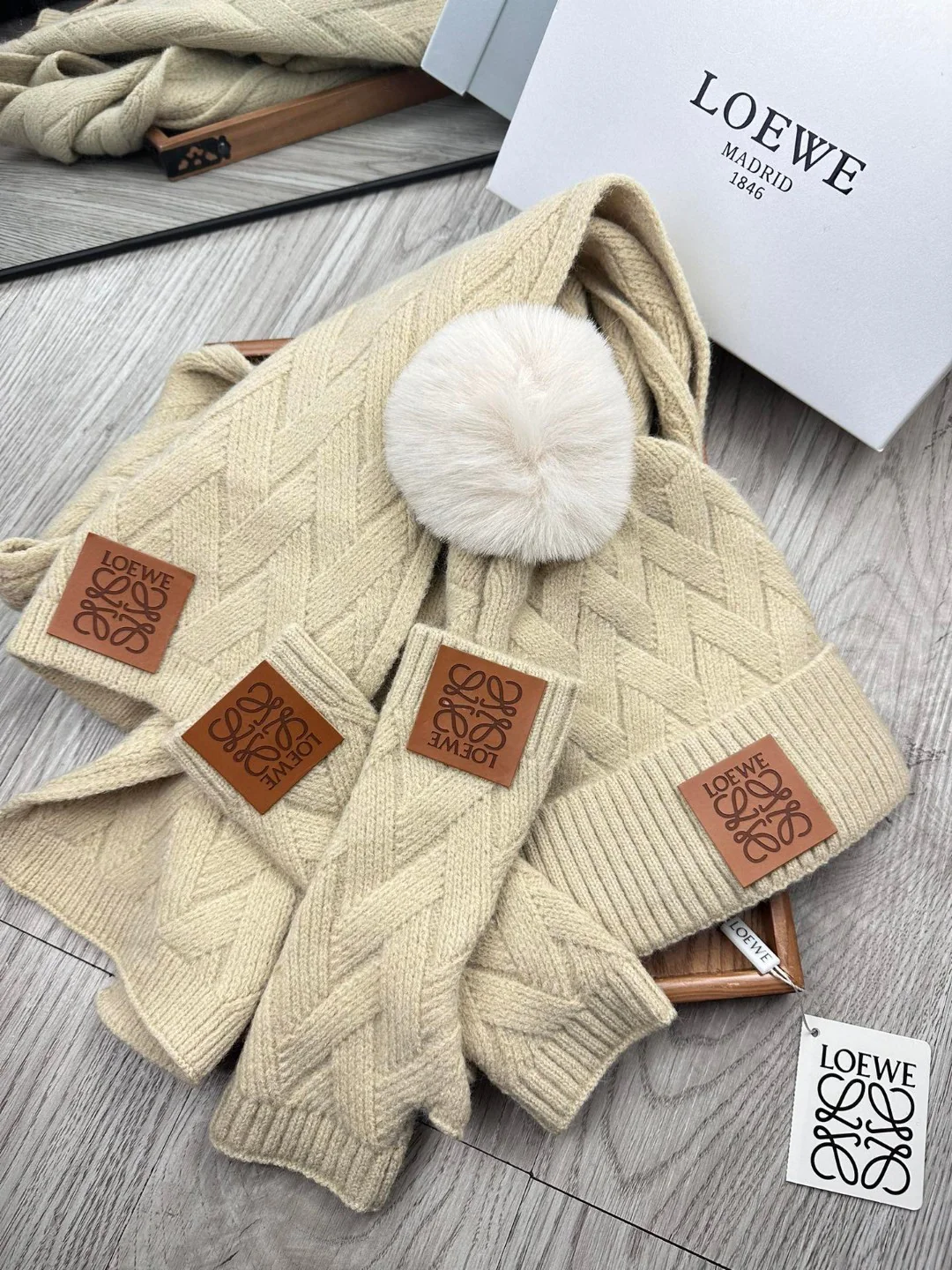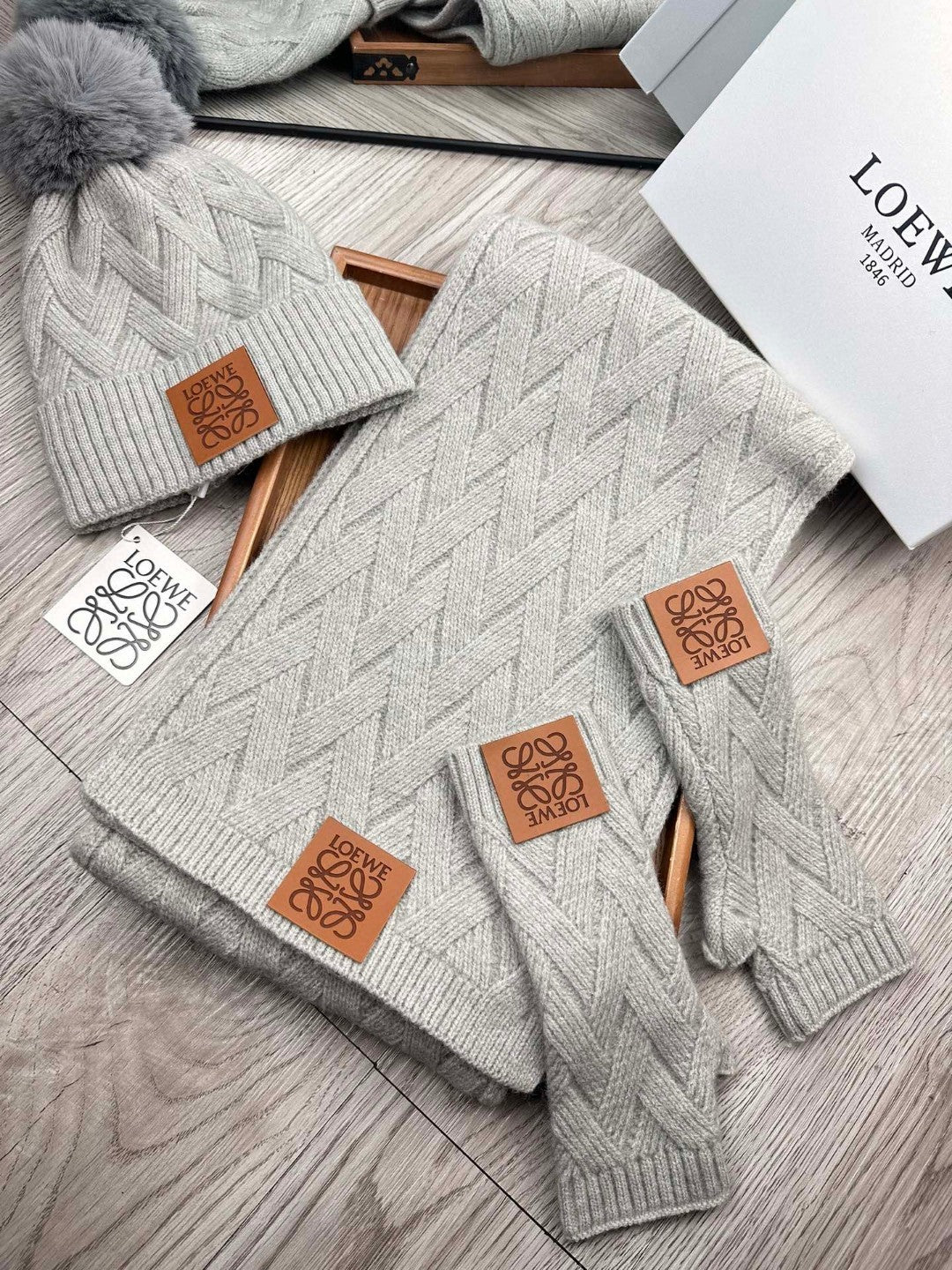 Leather label knitted scarf hat gloves set